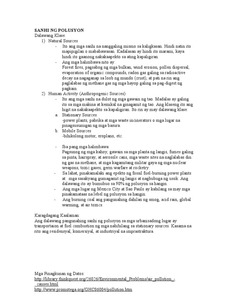 Saan kaya ito nangagaling. Bukod sa katiwalian kahirapan karahasan at nakakainis na takbo ng istorya sa mga drama sa tv isa pa sa mga araw-araw na problemang kinakaharap ng mga Pilipino ay ang problemang hatid ng maruming hangin air pollution sa. Dahil sa lumolobong problema ngpolusyon nararapat lang na alamin ang mga kemikal na nagdudulot ng sakit namakukuha sa hangin at kung paano ito masosolusyonan.