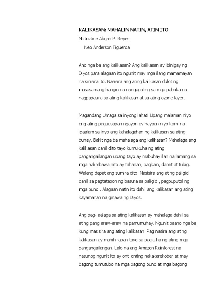Contextual translation of talumpati tungkol sa kalikasan into English. Talumpati Tungkol Sa Kalikasan Noon ako yung tipo ng tao na hindi ganun ka aktibo pag dating sa pagtulong sa kalikasan bagamat nakasali na ako sa mga aktibidad tulad ng pagtatanim ng puno pag takbo para sa kalikasan at pag lilinis ng kapaligiran sa aming eskwelahan wala parin akong pakialam sa nangyayari sa ating inang kalikasan. Talumpati tungkol sa kalikasan.