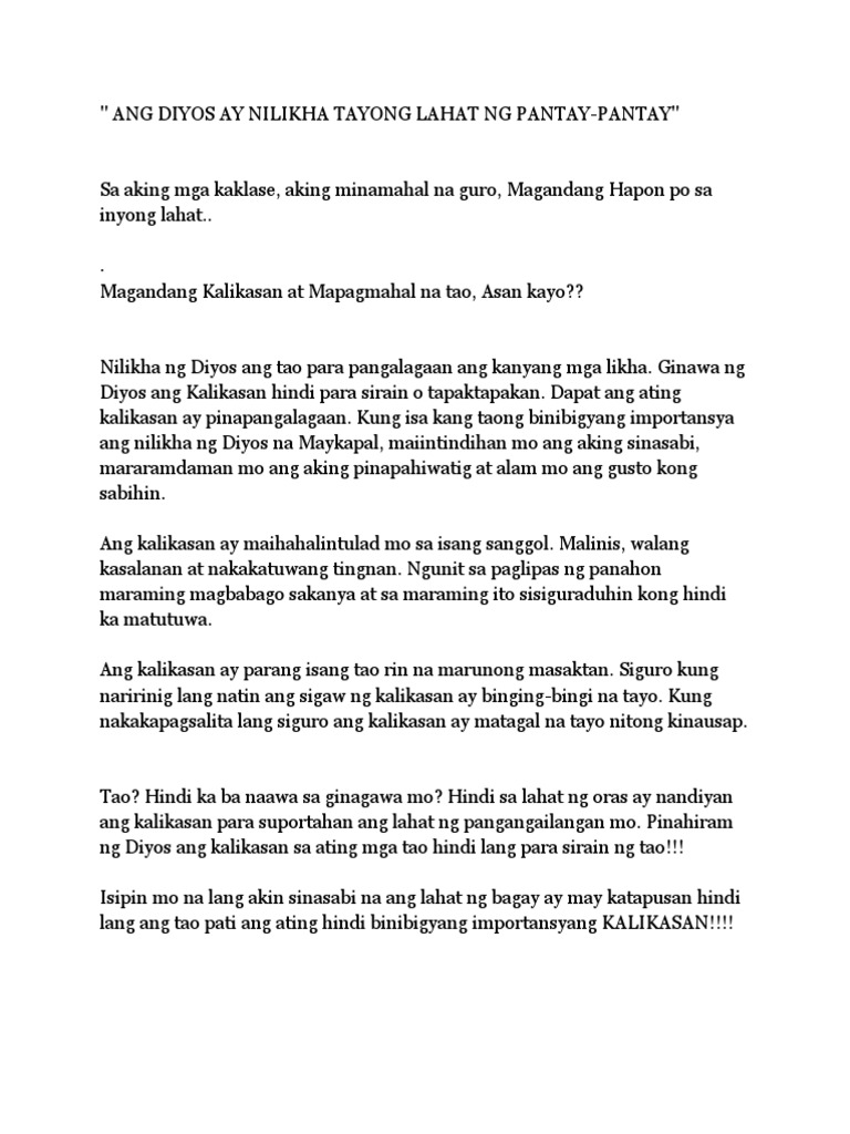 Muli akoy naririto ako sa inyong harapan para ipabatid at ipaalam sa inyo ang mga kaganapan tungkol sa ating kalikasan. Mga maikling talumpati tungkol sa pilipino. Check out our top free essays.