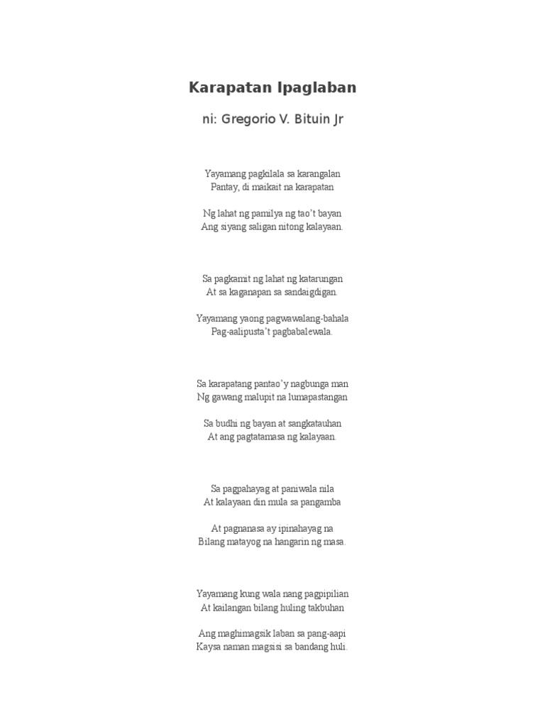 Bata man o matanda ay may karapatan Mahirap man o mayaman Lahat tayo ay may karapatan Na dapat nating ipaglaban. Filipino 27092020 1501 christiandumanon. Kundi ang tagapaglikha lamang na pinahiram mang tayo.