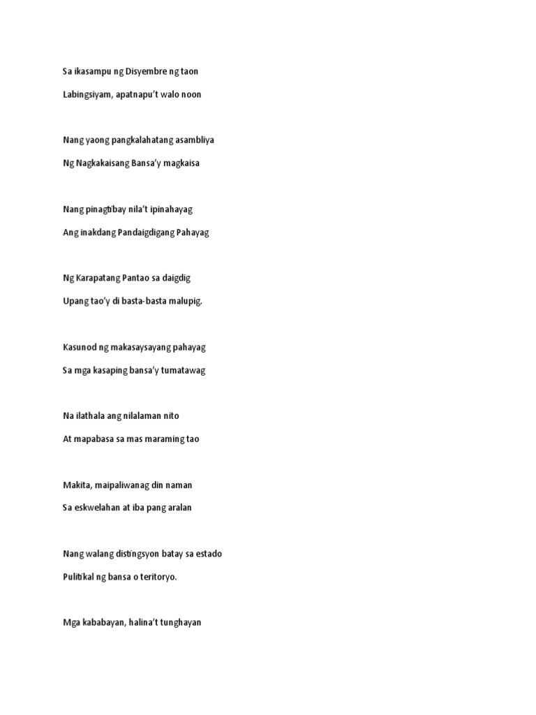 Tula tungkol sa karapatang pantao. Maayos na pamumuhay. Pagkat mga tulad nilay pawang iilan. Di niya karapatang maapi ninuman.