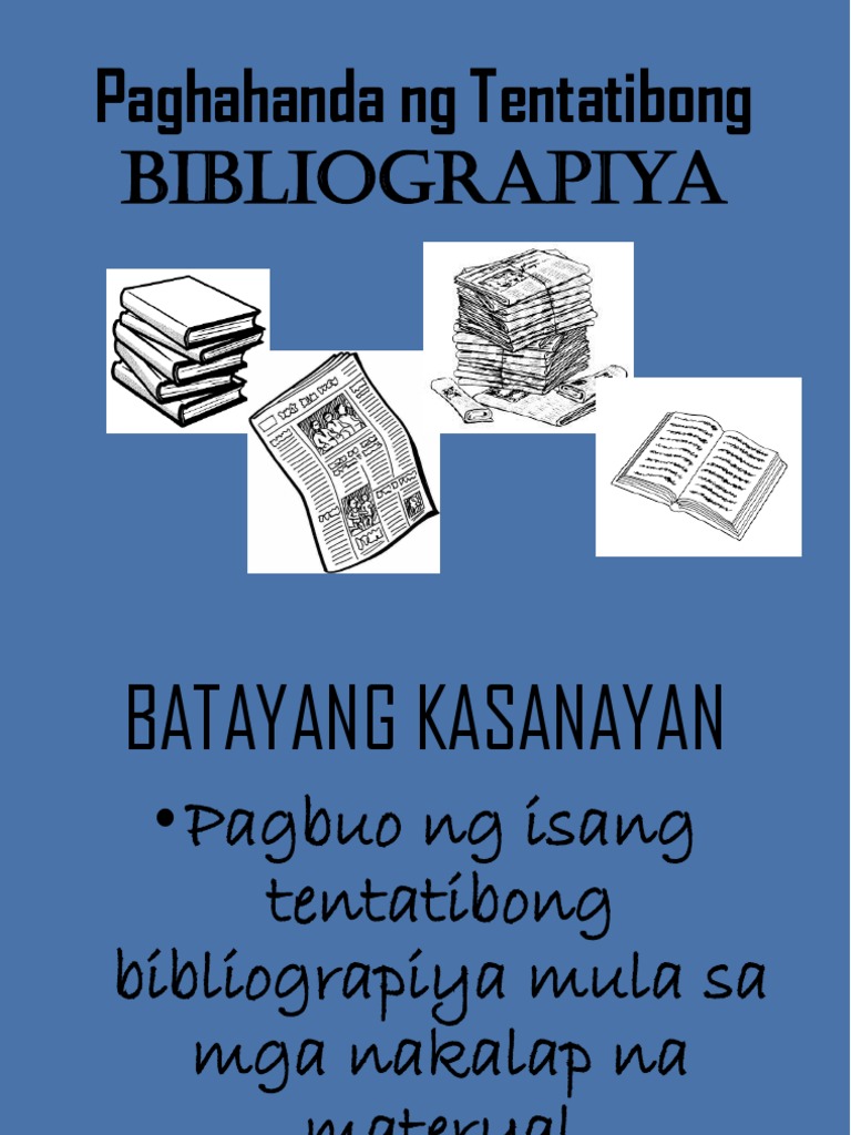 Bago mo isulat ang pinal na bibliyograpiya ay gumawa ka muna ng pansamantalang bibliyograpiya. MGA HALIMBAWA Diary Entries Mga Liham Mga Retrato Likhang sining ginawa sa panahon ng pagkakaganap ng pangyayari Mapa Video and Film 4. Ano bibliograpiya ito ay tinatawag na ugnayan o listahan ng isang hanay ng mga libro o sulatin na ginamit bilang sanggunian materyal o suportang dokumentaryo para sa pagsasaliksik at pagpapalawak ng isang nakasulat na akda o isang monograp.