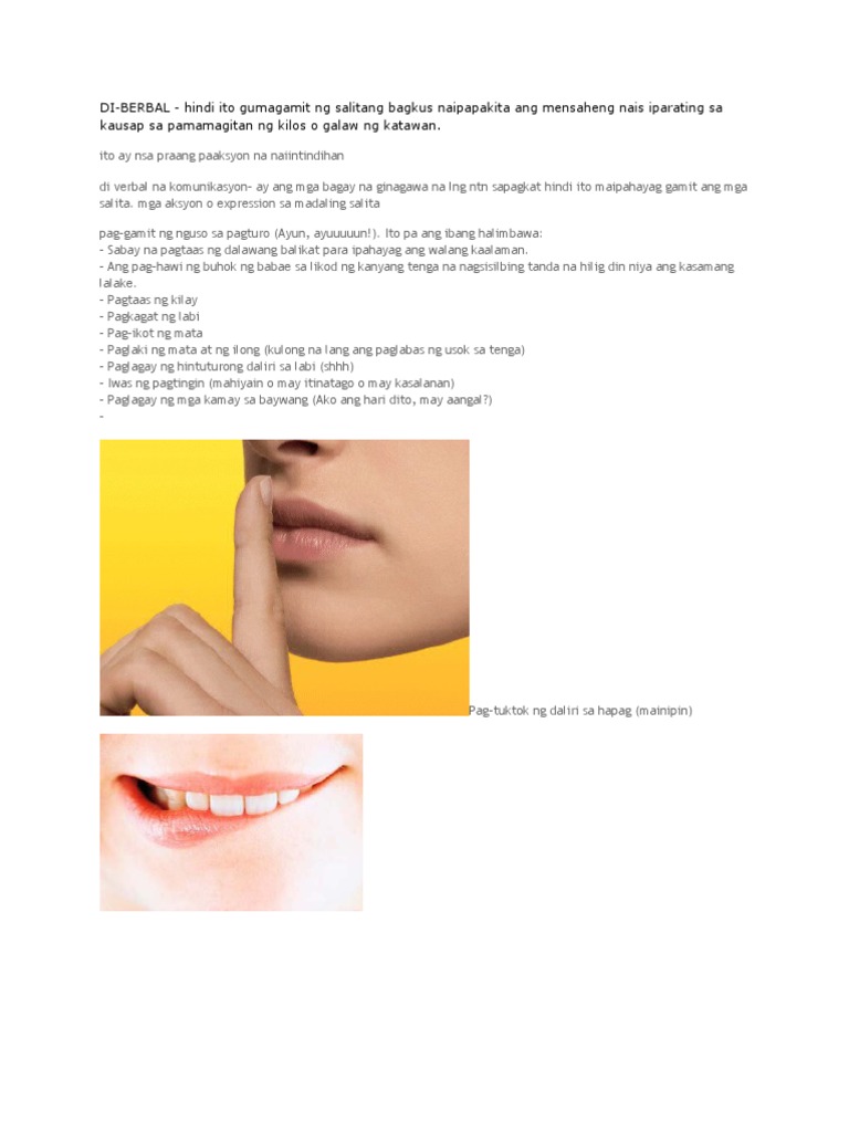 Halimbawa ng di berbal na komunikasyon. Sa paksang ito ay tinalakay ang uri ng komunikasyon at binigyang tuon ang di-bernal na komunikasyonNaway ikaw ay natuto. KOMUNIKASYON SA INTERDISIPLINARYONG PAGDULOG ANG KOMUNIKASYON SA KABUUAN MGA PAKSANG NILALAMAN. Mahalaga ang di-berbal na komunikasyon sapagkat.
