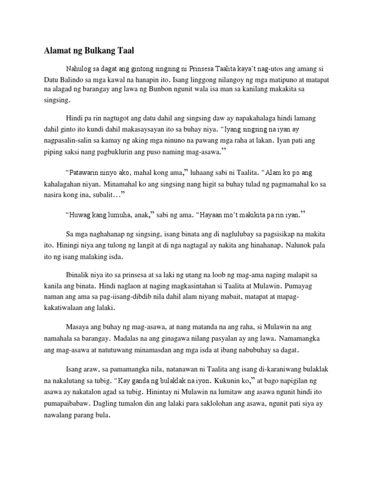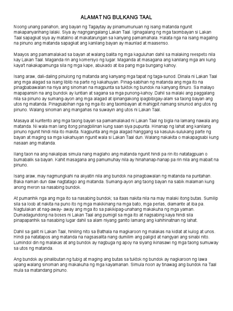 Mayroon isang Datu na bukod na kapita-pitagan ang kanyang reputasyon mabuti siyang pinuno maayos at maganda ang pamamalakad sa kanyang nasasakupan. By Admin on 45900 PM. Alamat ng Bulkang Taal Ayon sa salit-saling sabi ng matatanda ang mga bayan at lalawigan sa Gitnang Luson ay nahahati ng mga ilog at magubat na kabundukan.