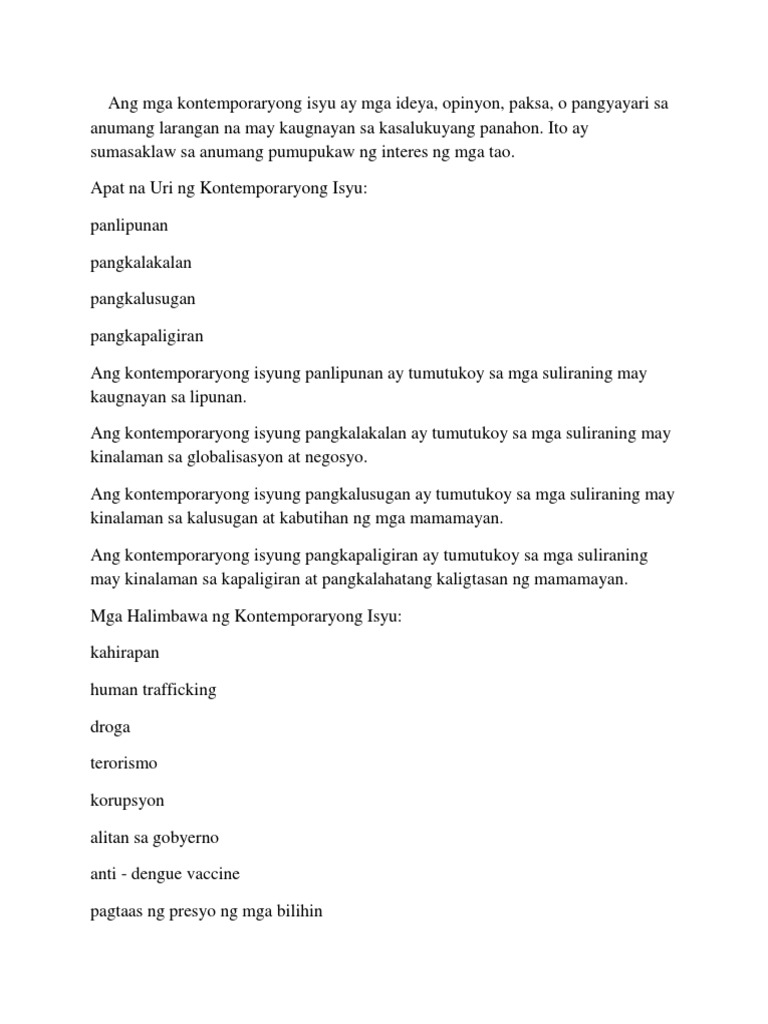 Ang kontemporaryong isyu ay naglalarawan sa mga pangyayari ganap opinyon ideya o paksa tungkol. May apat na uri ng kontemporaryong isyu ang isyung panlipunan pangkalakalan - 24931326. Ang isyung pangkalakalan ay isa sa mga kontemporaryong isyu sa ating lipunan.